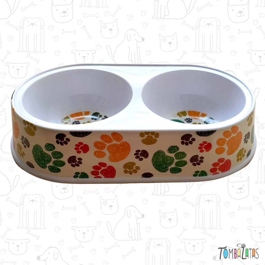Comedouro e bebedouro duplo com desenhos de patinhas coloridas.
