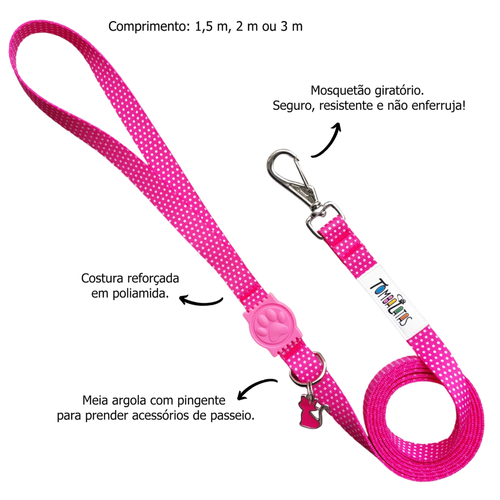 Feito com fitas 100% poliéster ultra soft de 1,5 cm de largura, fechos e reguladores de poliacetal (bem mais resistente que o plástico comum) e metais de ferro niquelado e Zamak resistentes à ferrugem.