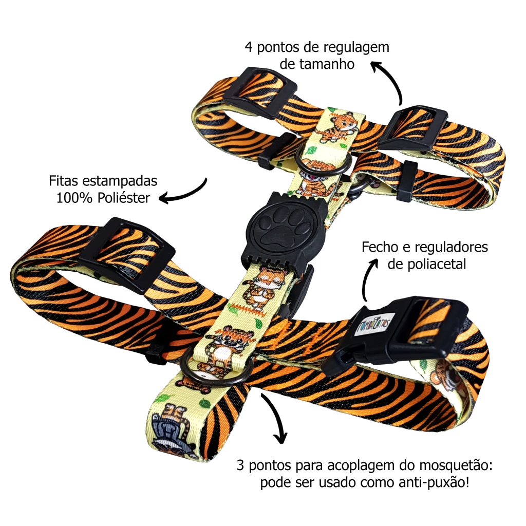 Peitoral: O modelo H do peitoral é a combinação perfeita de conforto e controle. Com 4 pontos de regulagem, você pode ajustar perfeitamente ao corpo do seu pet, garantindo um encaixe perfeito. Além disso, possui 3 pontos para acoplagem do mosquetão, permitindo o uso como anti-puxão. Adeus, puxões indesejados!