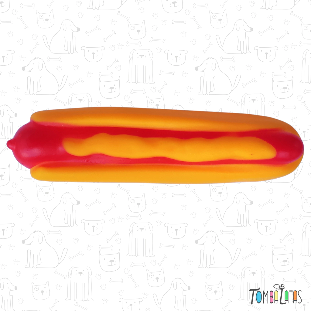 Brinquedo mordedor de borracha em formato Hot-Dog, com apito.