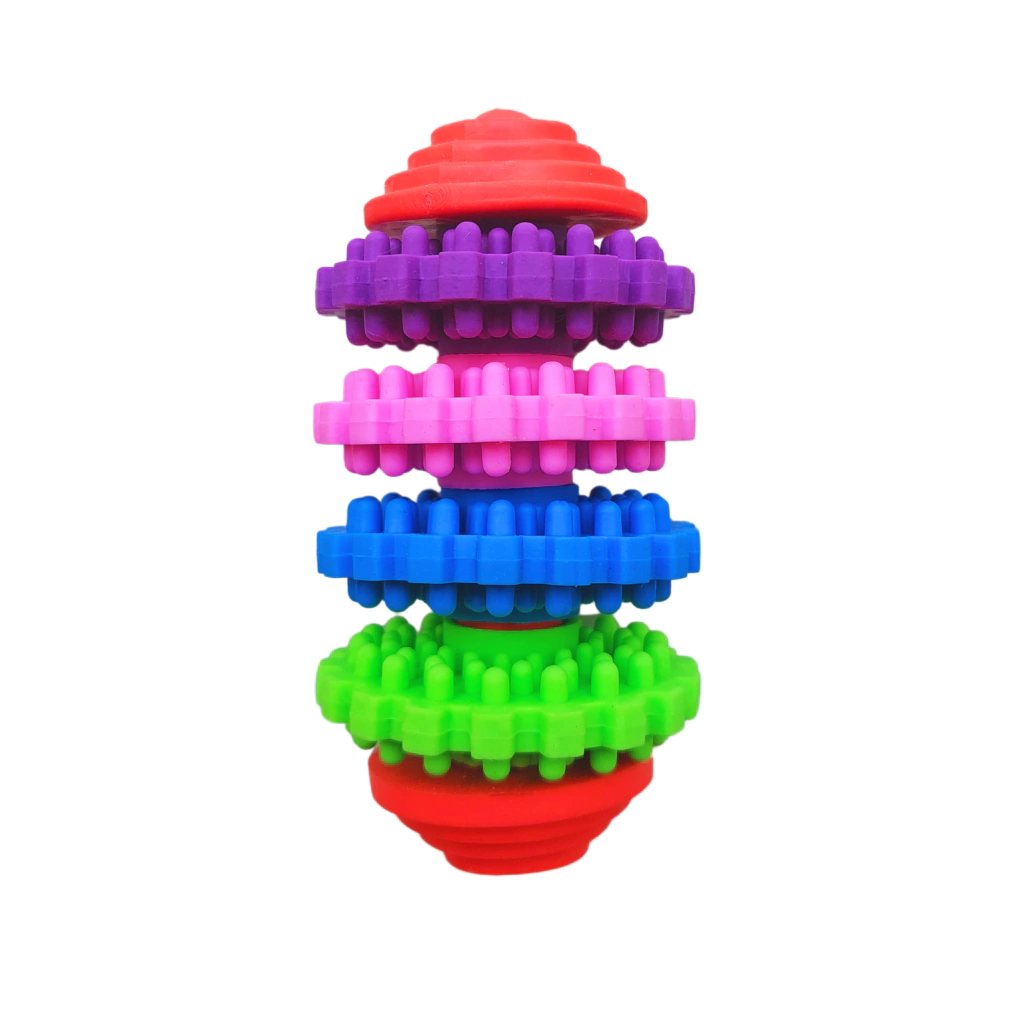 Cada peça circular é repleta de saliências texturizadas, proporcionando uma experiência tátil estimulante para o seu cão enquanto ele brinca. As texturas variadas ajudam a massagear as gengivas e promovem a saúde bucal, enquanto o formato cônico do brinquedo é ideal para estimular o instinto de mastigação do seu pet.
